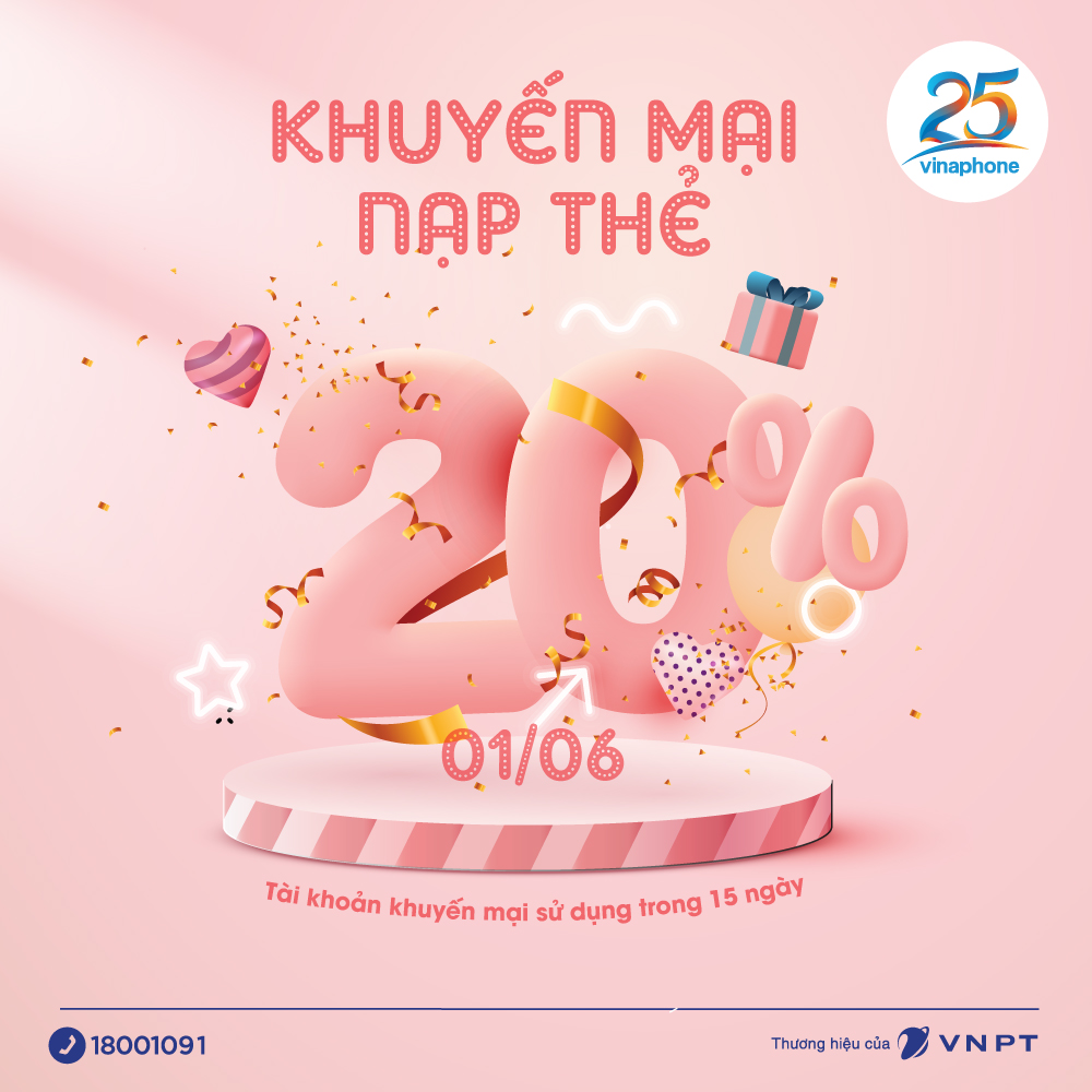 Tặng 20% giá trị thẻ nạp cho các thuê bao nhận được tin nhắn từ nhà mạng trong HÔM NAY 01/06.